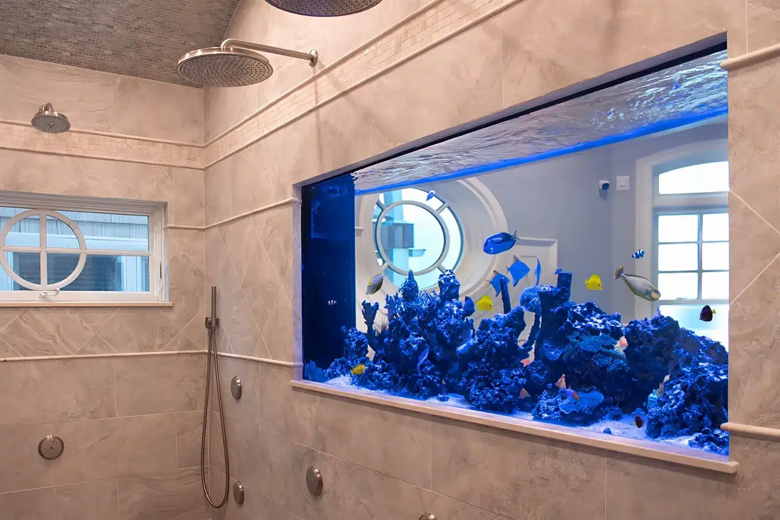 Aquariums, especially large marine setups, are heavy due to the combined weight of water, rock, and equipment. Structural reinforcements were added during the aquarium design phase to ensure that the flooring and walls could support the weight of the aquarium in the shower without causing damage over time.